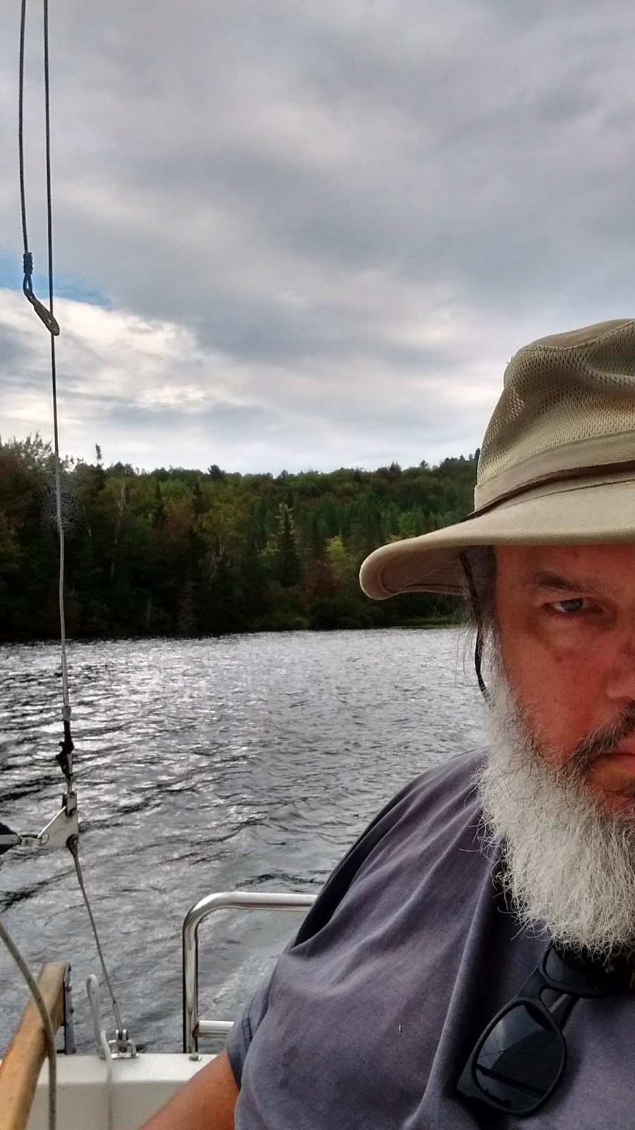 Finally I untied the lines and raised anchor. The weather until today had been perfect for sailing. Rain moved in while my lovely wife and I were out on the water. She was in the cabin taking a nap. It was warm so the rain didn't bother me at all. It still felt good to be sailing again.